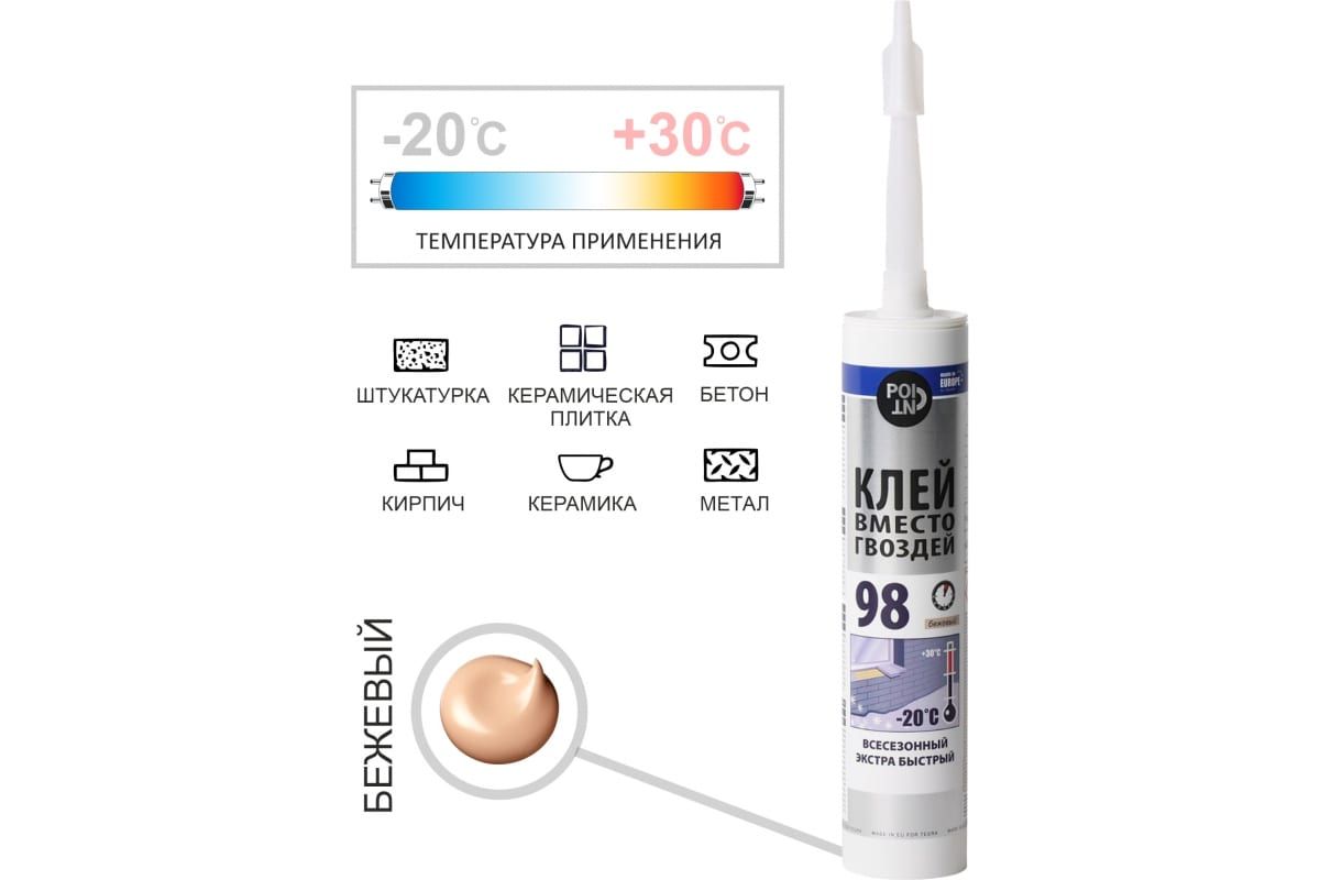 Всесезонный экстра быстрый клей вместо гвоздей POINT 98 280 мл 03-1-0-098 используют во время монтажных и отделочных работ для приклеивания плинтусов, цоколей, порогов, панелей, керамической плитки, для склеивания декоративных элементов.